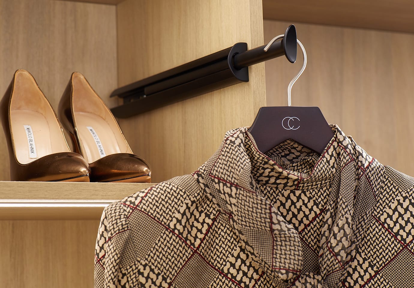 Walk in closet with hanging poles, lighting, and open wardrobe shelves by Jeremiah Brent and California Closets